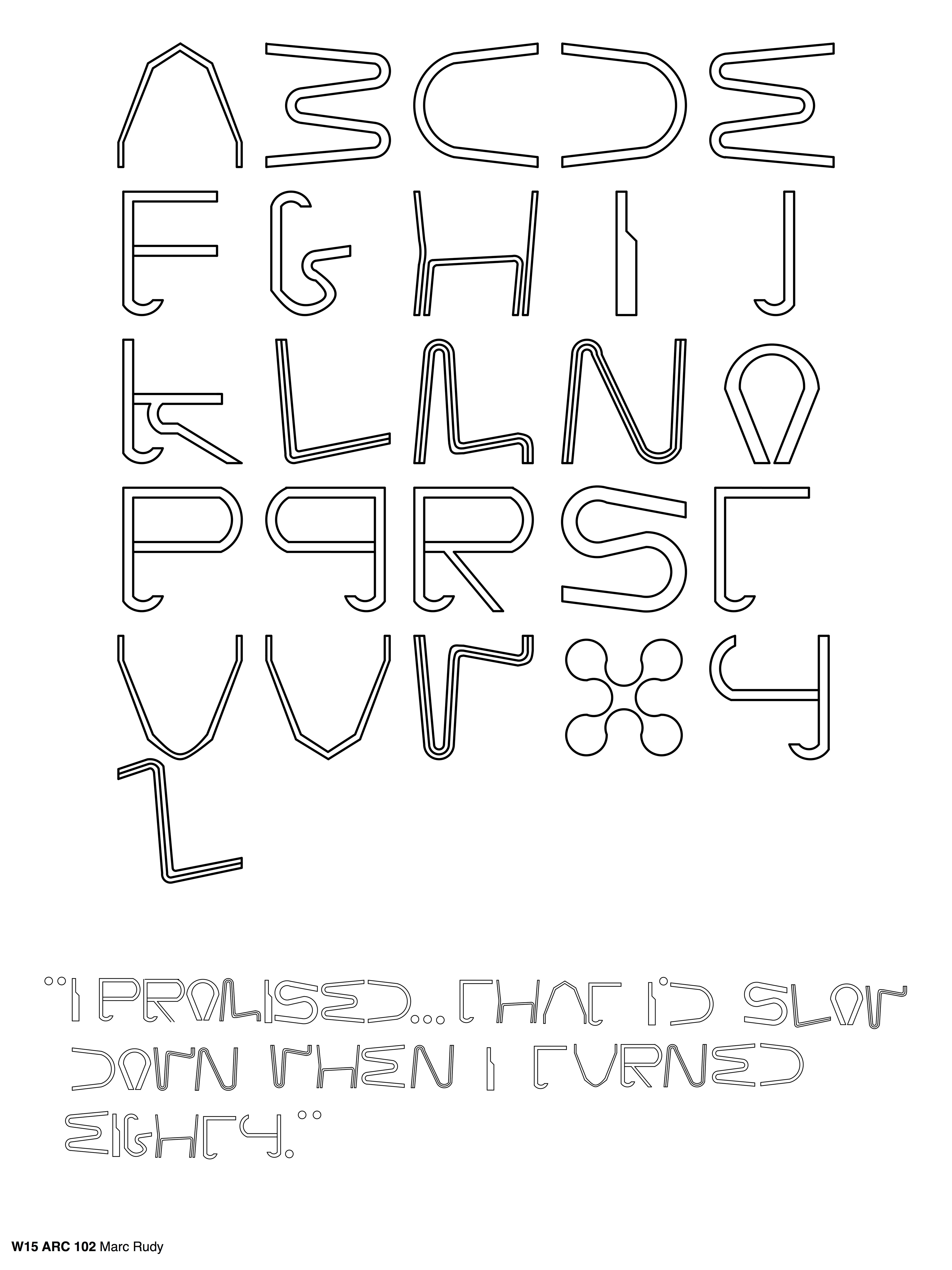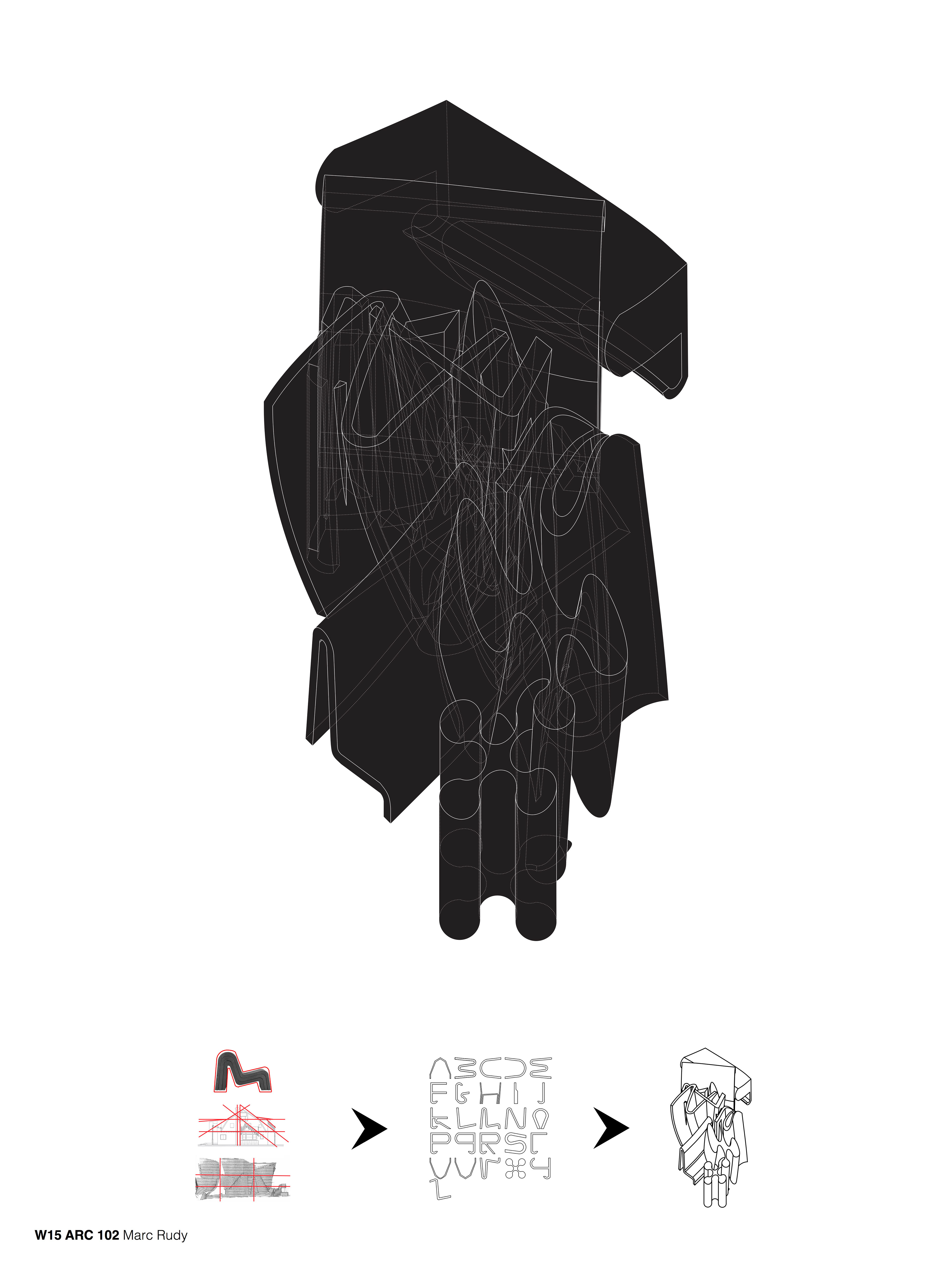 A typography inspired by Frank Gehry's sketches and designs. I began with analyzing datum lines and grid patterns, then applying it to an alphabet, and lastly making a form from the created typography.