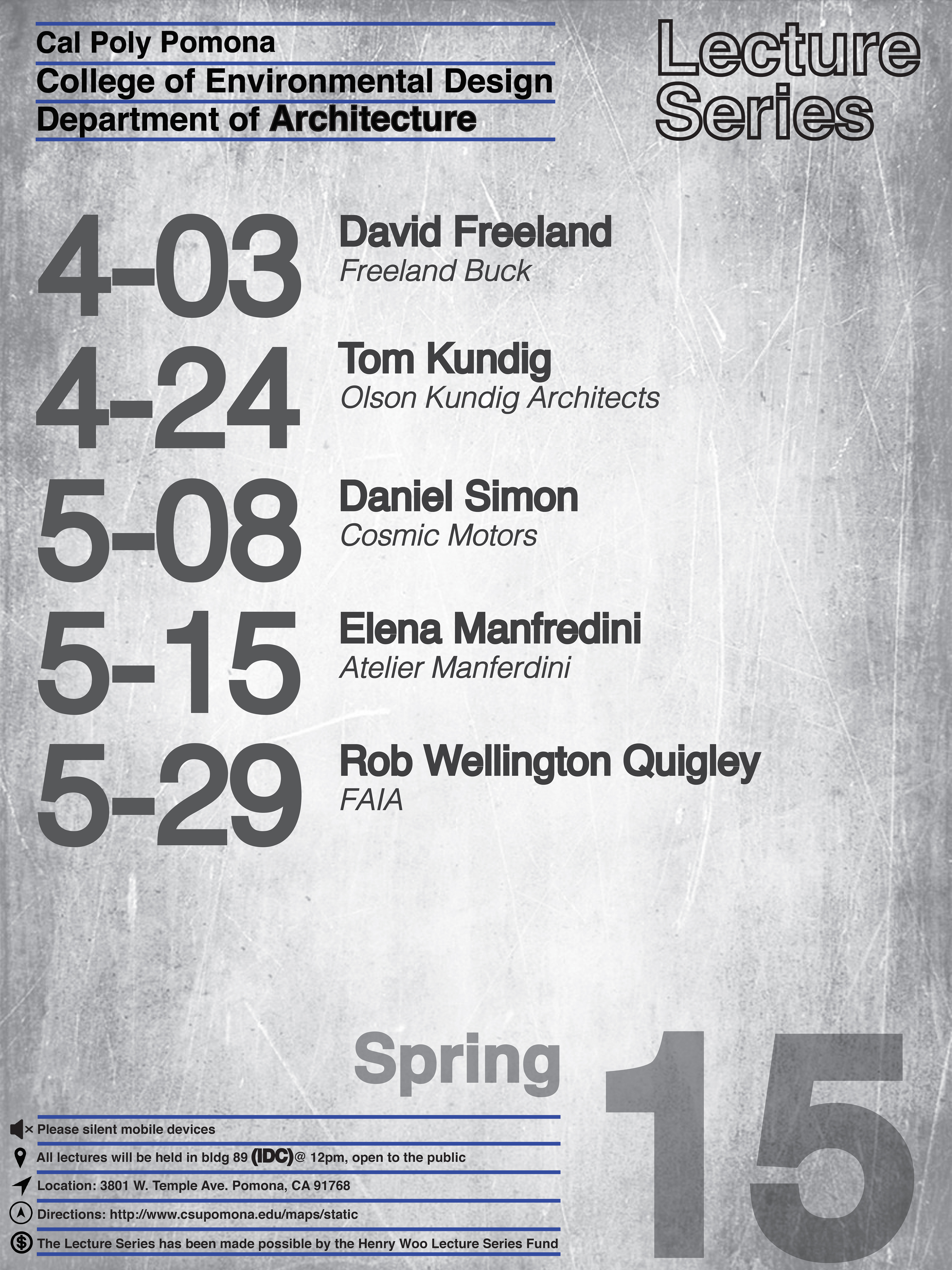 An entry for a student competition to design a legible and attention-grabbing poster for the CPP Department of Architecture's quarterly lecture series.